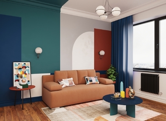 Спинка, выполненная в обивочной ткани, позволяет ставить диван в центре комнаты и зонировать пространство.