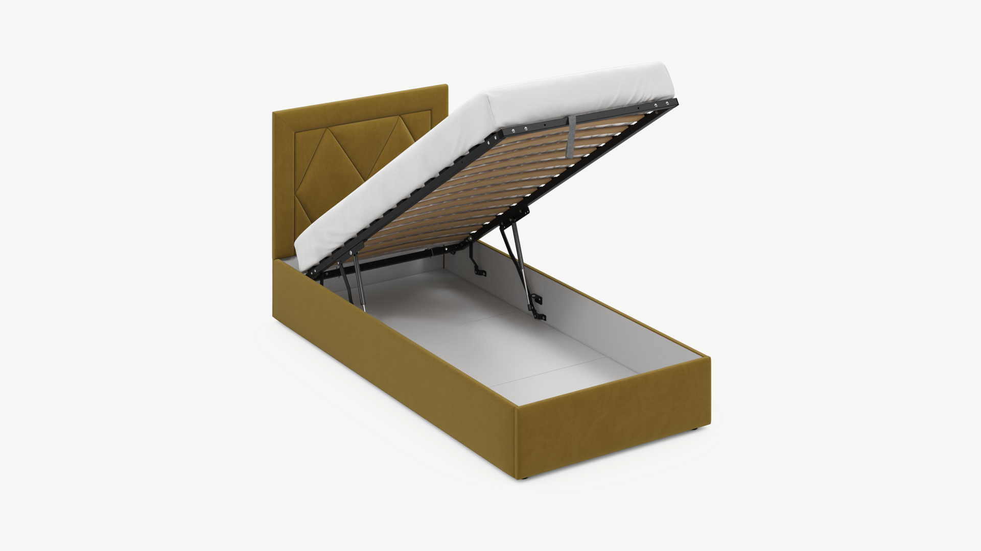 • Скрытая под основанием вместительная емкость без внутренних перегородок позволяет использовать всю площадь подкроватного пространства для хранения вещей.