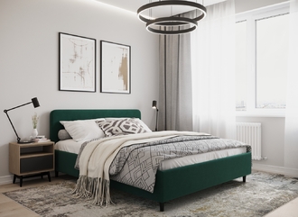 Царга, задающая пропорции, благодаря гладкости своей фактуры подчеркивает центральный элемент декора. Высокие опоры приподнимают фигуру кровати над полом и добавляют её образу визуальной легкости.