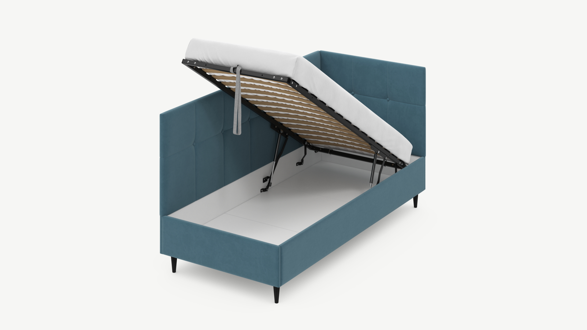 • Скрытая под основанием вместительная емкость без внутренних перегородок позволяет использовать всю площадь подкроватного пространства для хранения вещей.