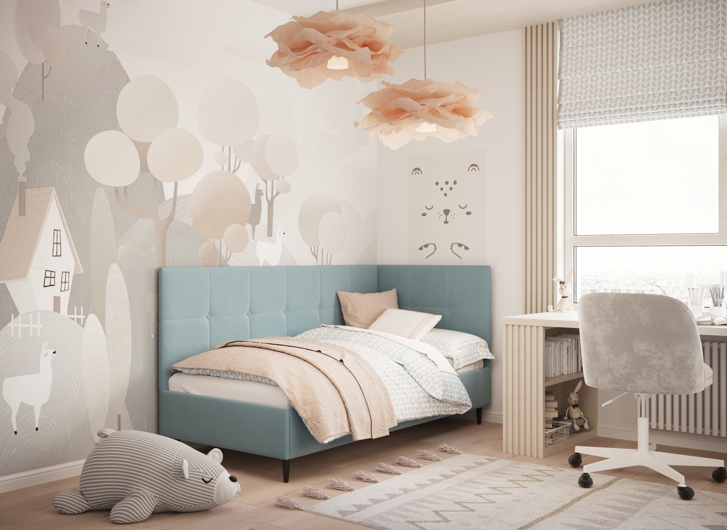 MOON FAMILY 1261 объединяет функциональность и стиль, создавая гармоничное пространство для отдыха и творчества. Кровать доступна в левостороннем и правостороннем исполнении, что позволяет легко адаптировать ее под любые интерьерные особенности.