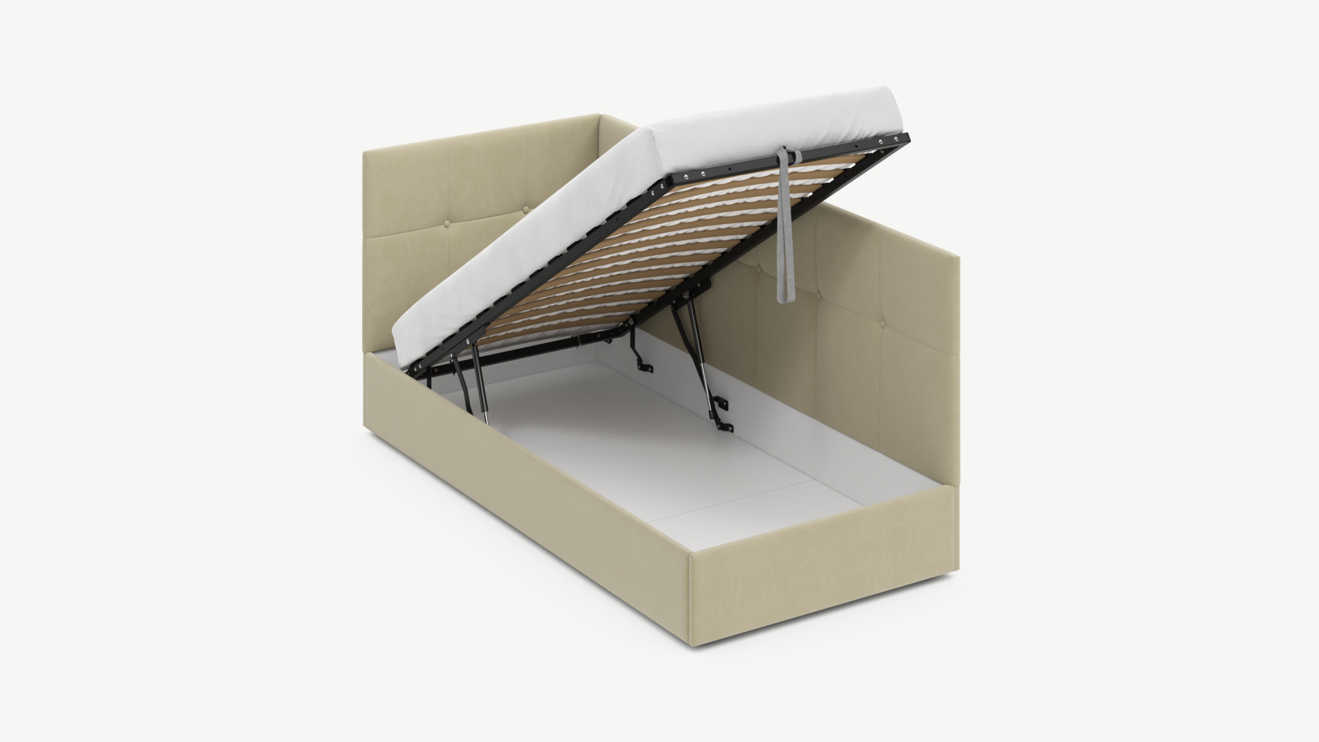 • Регулируемый подъемный механизм имеет два положения установки газовых амортизаторов в зависимости от веса матраса. Это дает возможность оптимально подстраивать угол подъема основания, а также плавно и бесшумно поднимать и опускать спальное место.