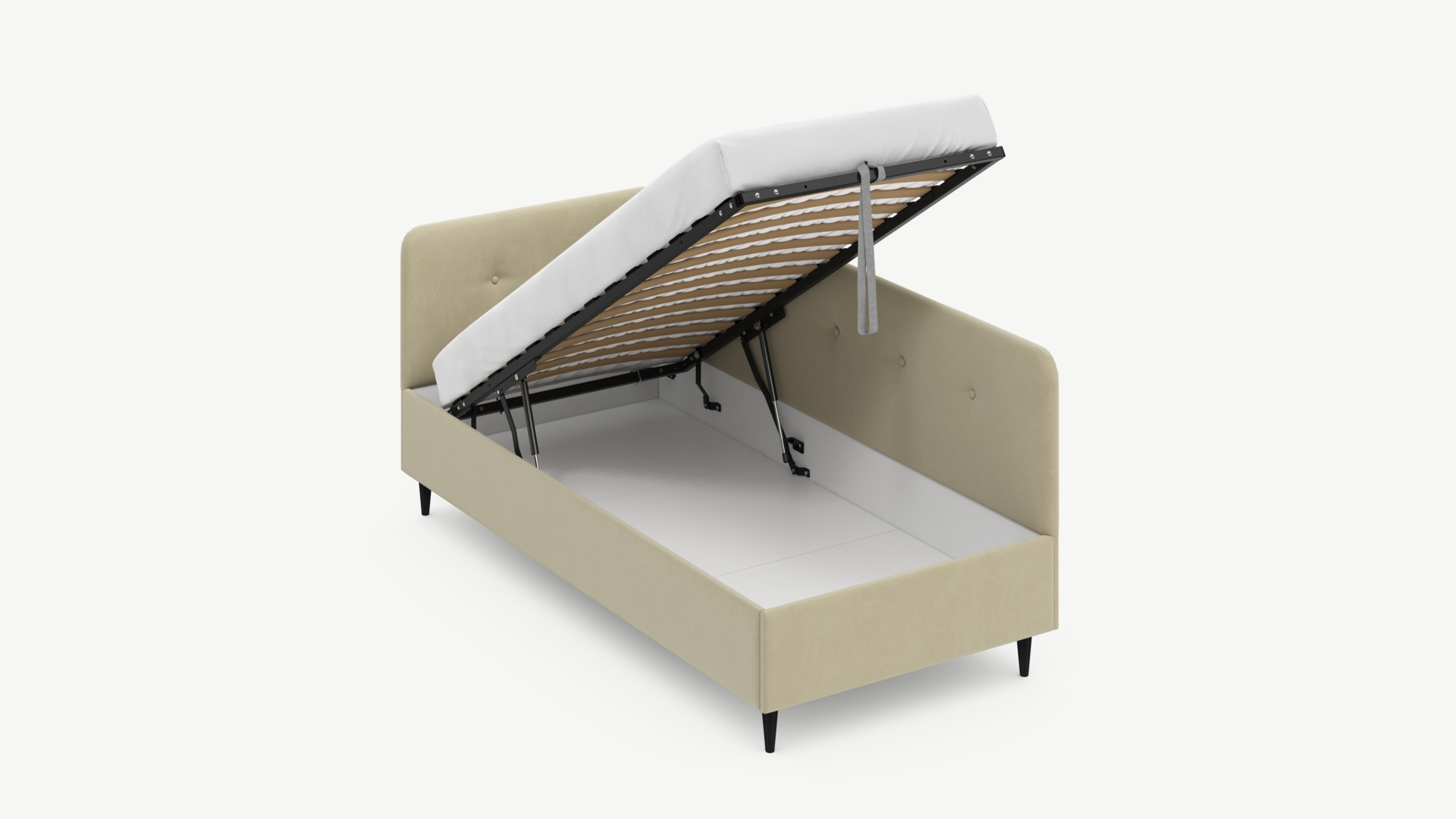 • Скрытая под основанием вместительная емкость без внутренних перегородок позволяет использовать всю площадь подкроватного пространства для хранения вещей.