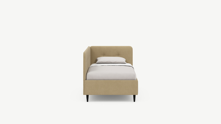 Угловая односпальная кровать MOON FAMILY 1253 с мягкой спинкой и изголовьем обладает округлыми формами, привносящими в интерьер нотки нежности. Изголовье, украшенное пуговицами, добавляет окружающему пространству шарм и уют. Высокие опоры придают кровати визуальной легкости, а также обеспечивают удобство во время уборки.