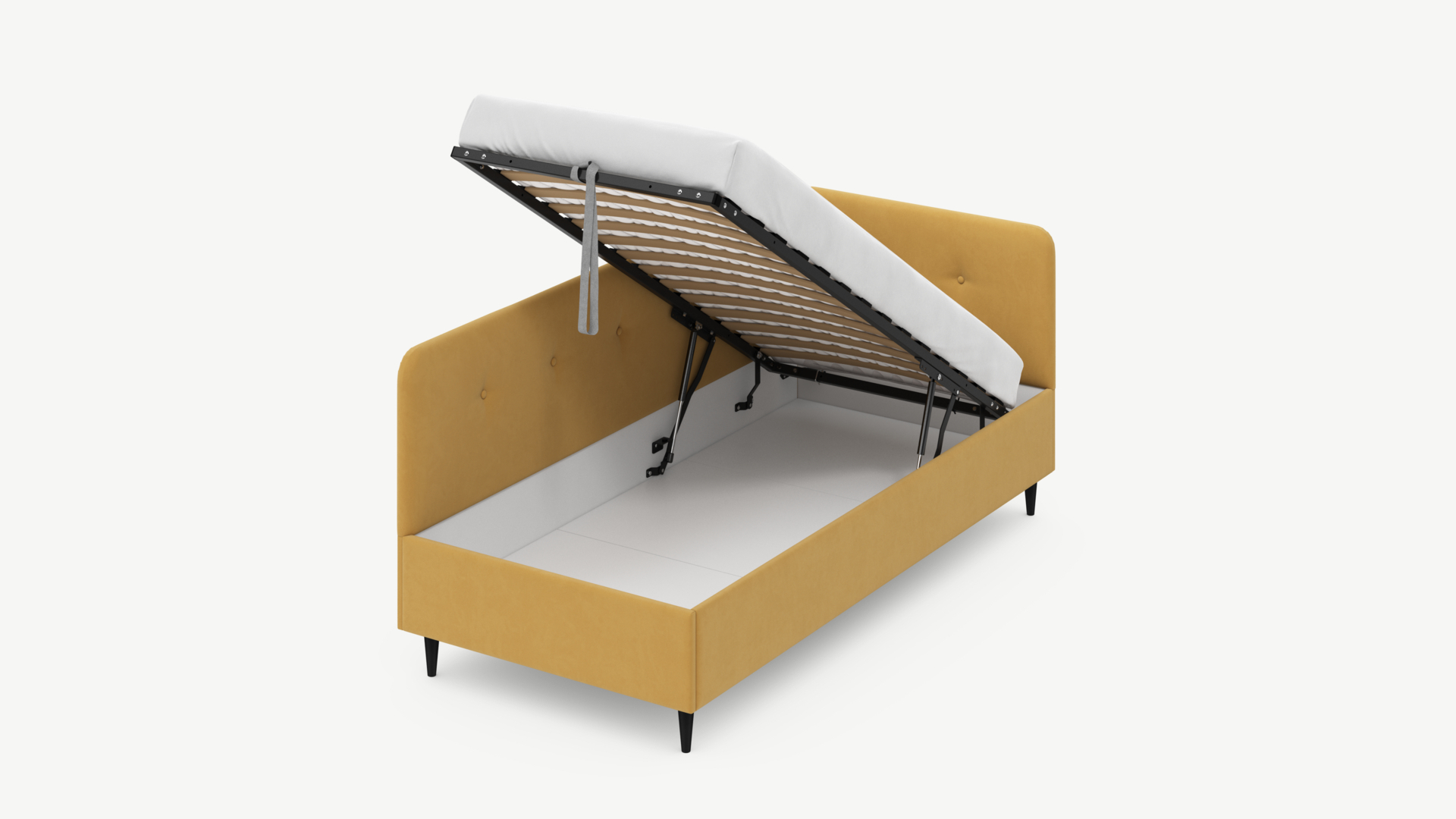 • Скрытая под основанием вместительная емкость без внутренних перегородок позволяет использовать всю площадь подкроватного пространства для хранения вещей.