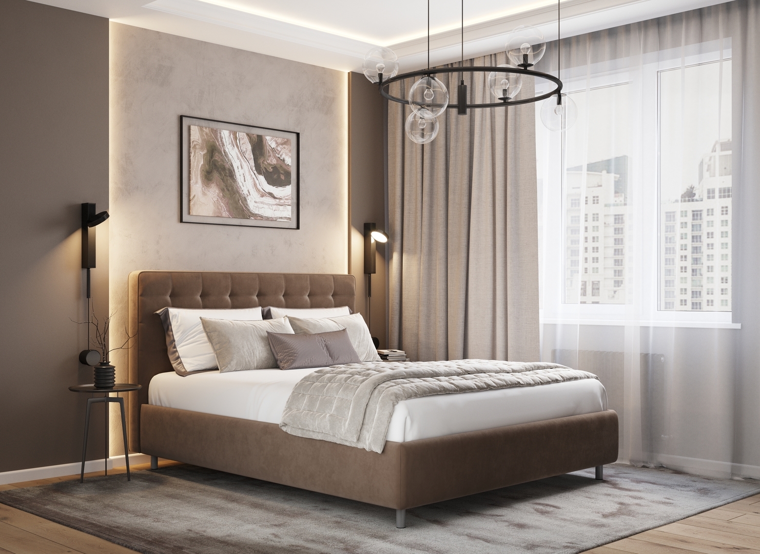 Оформите образ кровати, выбирая обивочный материал, который подчеркнет звучание Вашей спальни и отразит Ваш вкус. Обратите внимание на однотонный гладкий велюр, который усиливает объемную фактуру стежки.