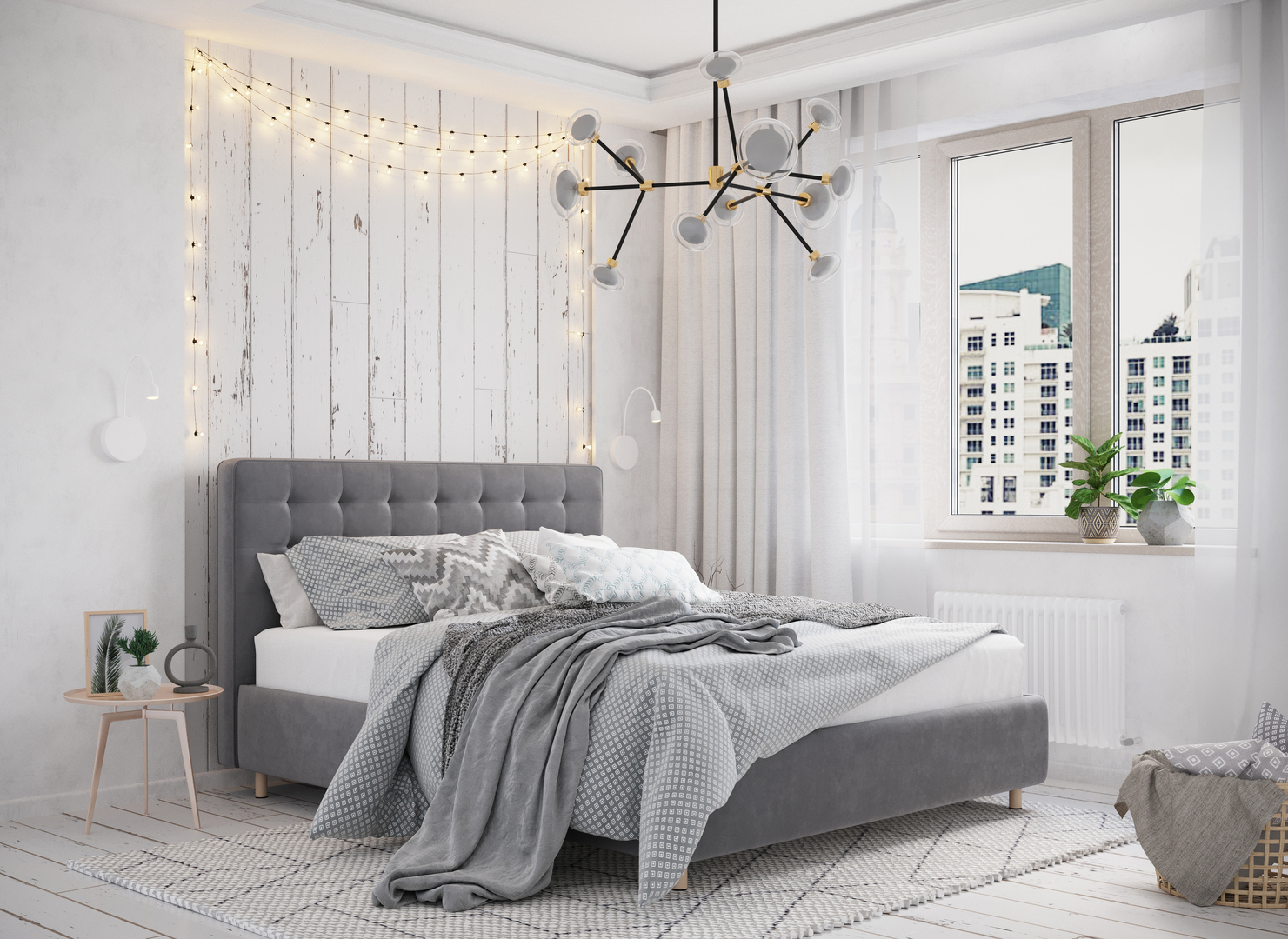 Обратная сторона изголовья выполнена в мебельной ткани и позволяет ставить кровать в центре комнаты для зонирования пространства.