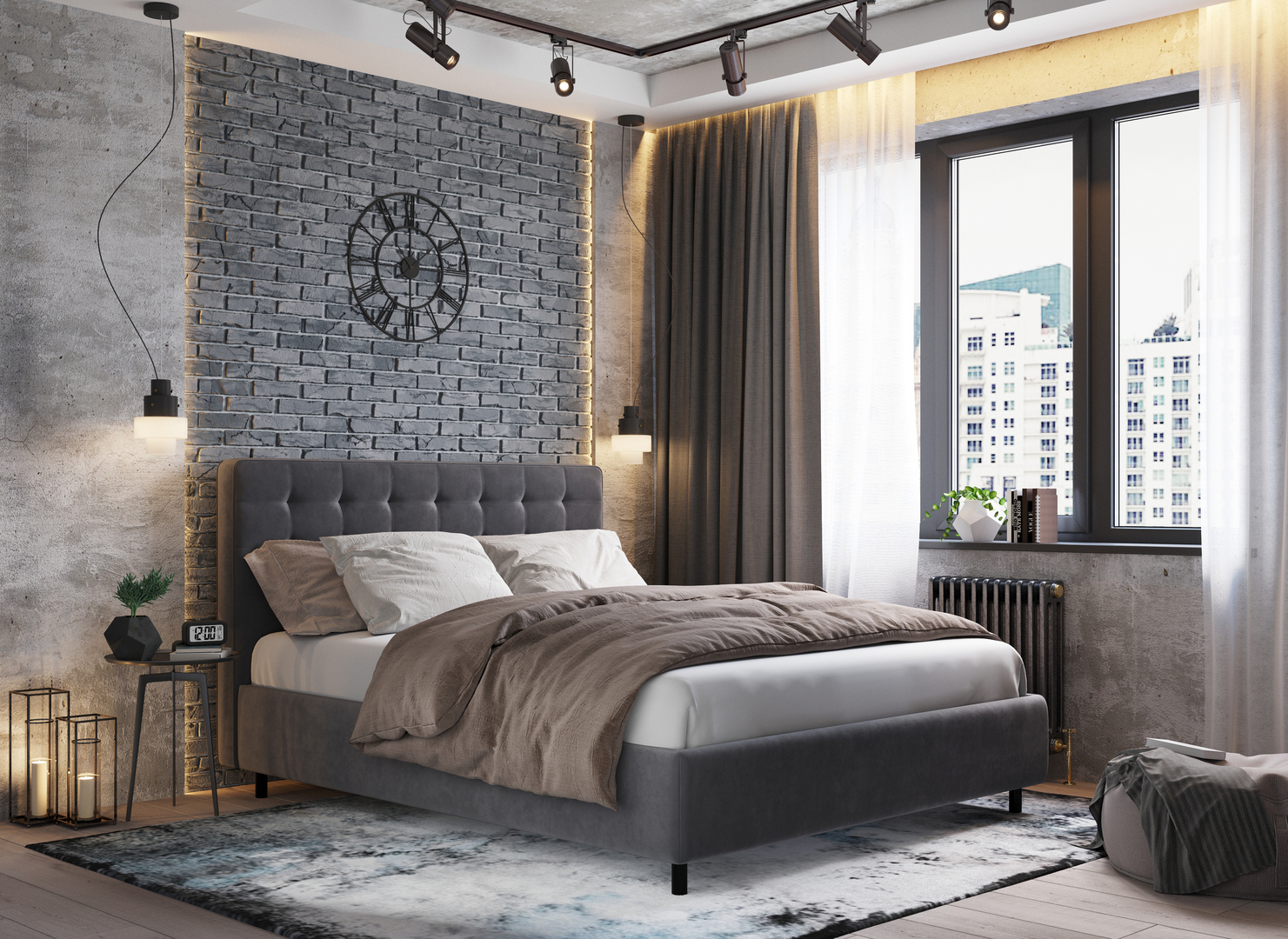 Обратная сторона изголовья выполнена в мебельной ткани и позволяет ставить кровать в центре комнаты для зонирования пространства.