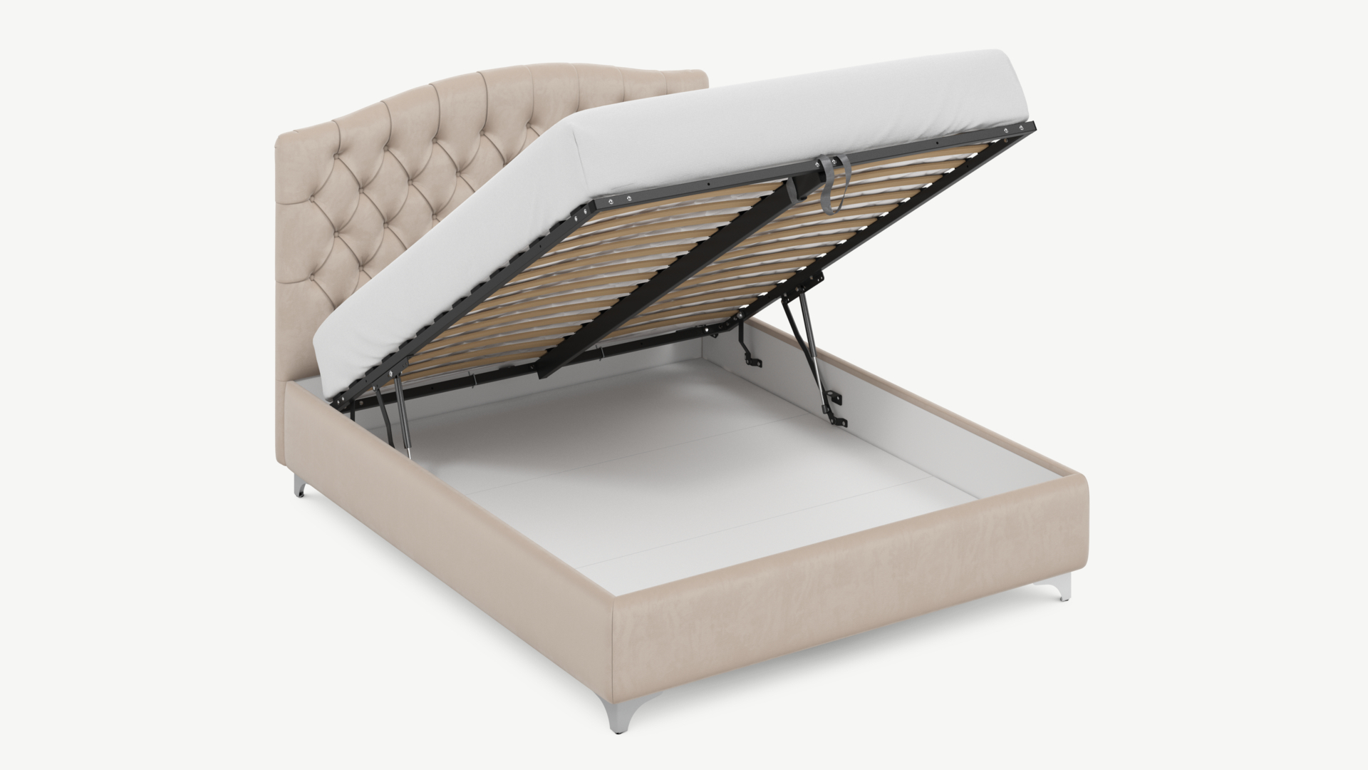 • Скрытая под основанием вместительная емкость без внутренних перегородок позволяет использовать всю площадь подкроватного пространства для хранения вещей.